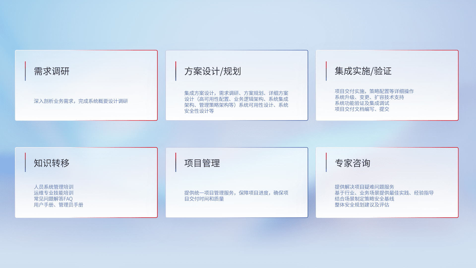 针对客户行业特性,,,,将宏观的安全战略和需求,,,通过专业的交付服务,,,实现项目落地,,,为客户提供标准规范的集成交付服务。。。